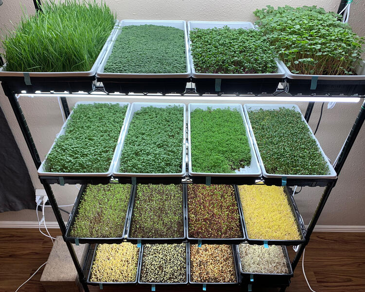 Pea, Sunflower, Wheatgrass, Broccoli, Radish, Spicy Salad Mix, Beet, Lettuce, and more.